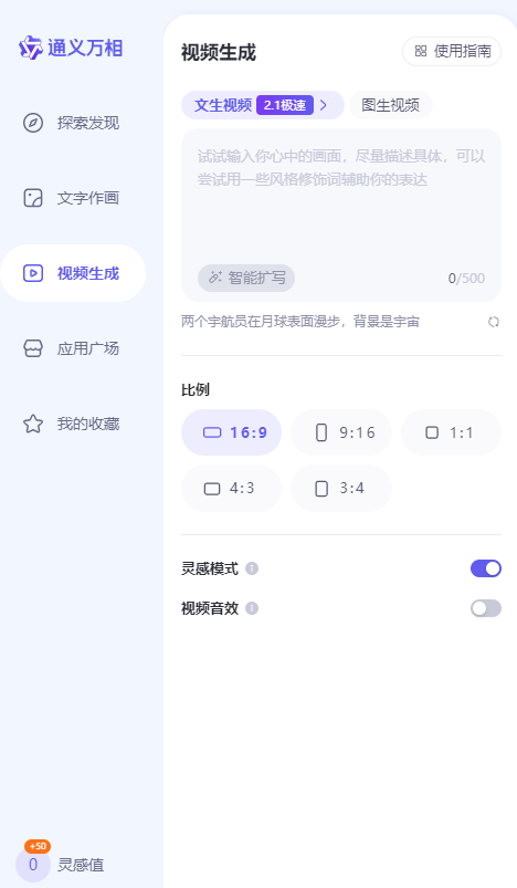 进入创作视频页面,默认是文生视频。输入提示词后选择视频比例,点击【立即生成】。